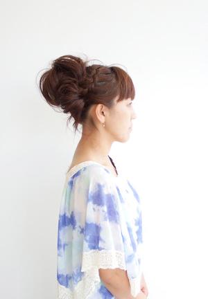 トップにボリュームを持たせ、カールでデザイン。サイドに編みこみを入れてアクセントに。